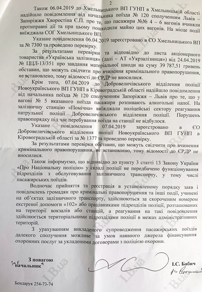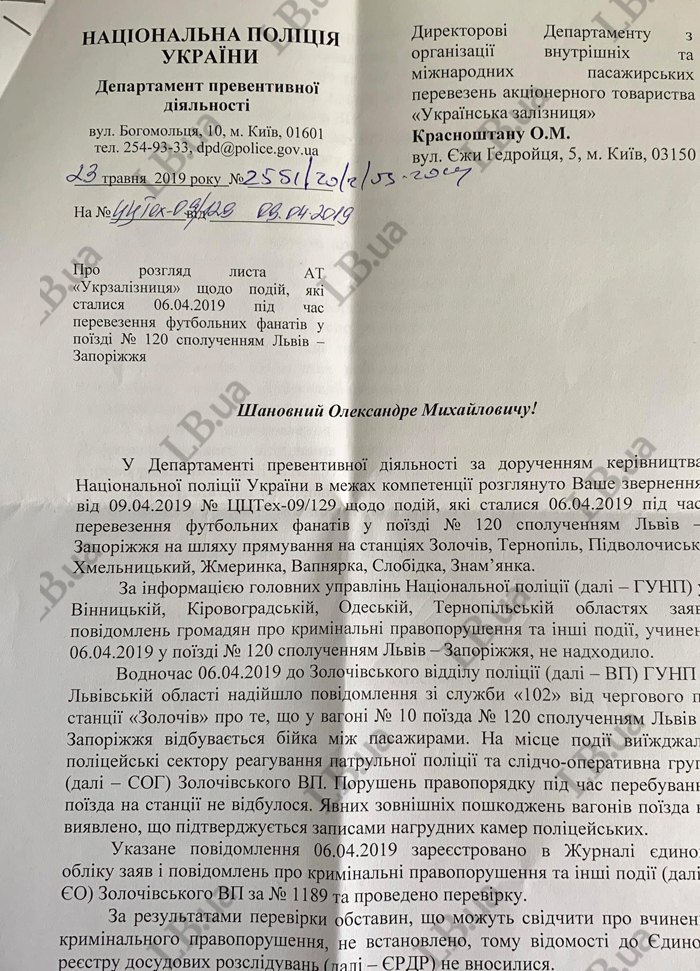 Исходя из ответа, полицейские 4 раза выезжали на вызов поездной бригады, однако не заметили нарушений общественного порядка. Именно поэтому правоохранители не приняли никаких мер в отношении фанатов "Карпат". Примечательно, что "Укрзализныця" заявляла о ущербе в 39.000 гривен, который был нанесен вагонам. По их заявлению, футбольные болельщики ФК "Карпаты", которые сели в поезд на станции Львов, повредили оборудование вагонов №4,5 и 6. В частности, было разбито 12 окон в вагонах и тамбурах, из поезда хулиганы выбросили 21 матрац, 25 подушек, 25 постельных комплектов, 3 огнетушителя и одно зимнее одеяло. На это заявление в полиции ответили, что при осмотре "явных повреждений вагонов не было, что подтверждается видео с нагрудных камер". В итоге информация о погроме состава не была внесена в единый реестр происшествий.